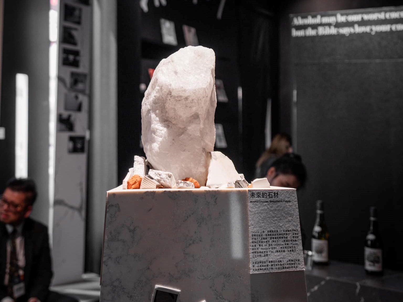 展區內的桌面不僅讓人一觸即知它的溫潤質感,更令人驚豔的是團隊將廢棄的木材和玻璃壓製進石英石,賦予廢料新生命。這樣的永續設計讓建材不再只是冷冰冰的裝飾,而是充滿故事與創意的藝術品,傳達出品牌對環境的關懷與設計的前瞻性。